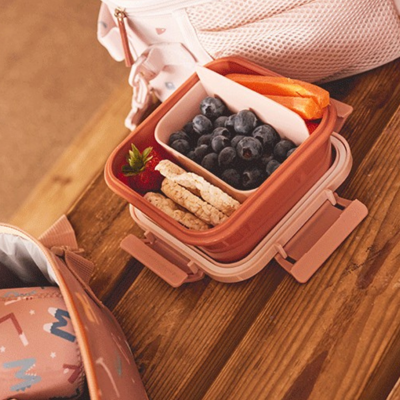 Monnëka Lancheira Bento Stripes Apricot é ideal para manter os alimentos organizados, frescos e prontos para desfrutar, seja na escola ou em passeios!