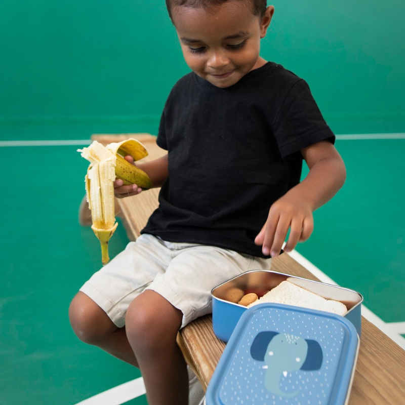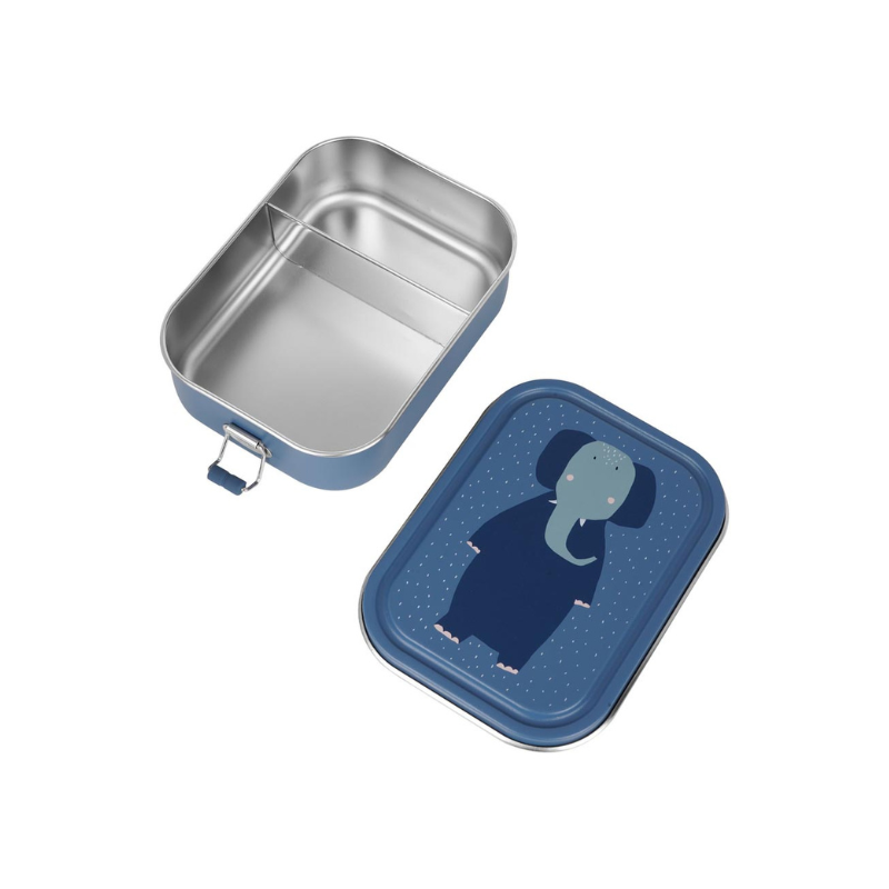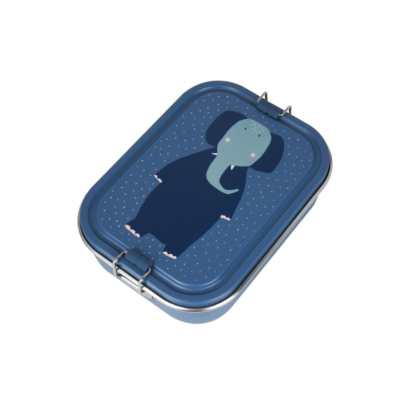 A lancheira Metal Grande Mrs. Elephant fabricada em aço inoxidável, decorada com os simpáticos amigos animais que combinam perfeitamente com as mochilas e garrafas da mesma coleção.