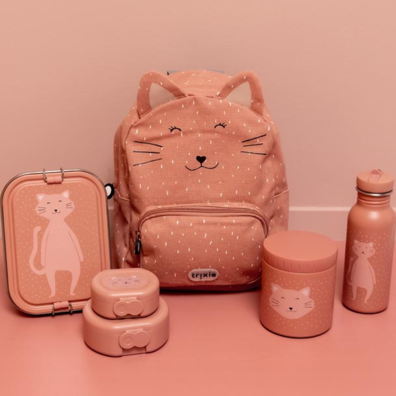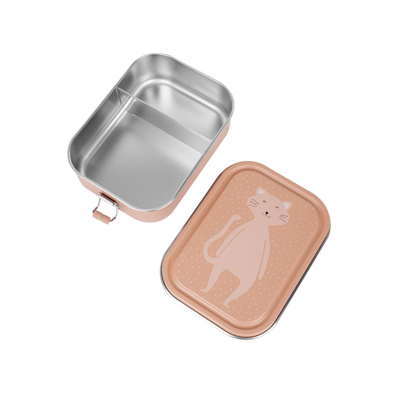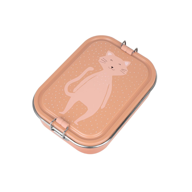 A lancheira Metal Grande Mrs. Cat fabricada em aço inoxidável, decorada com os simpáticos amigos animais que combinam perfeitamente com as mochilas e garrafas da mesma coleção.