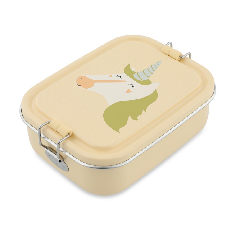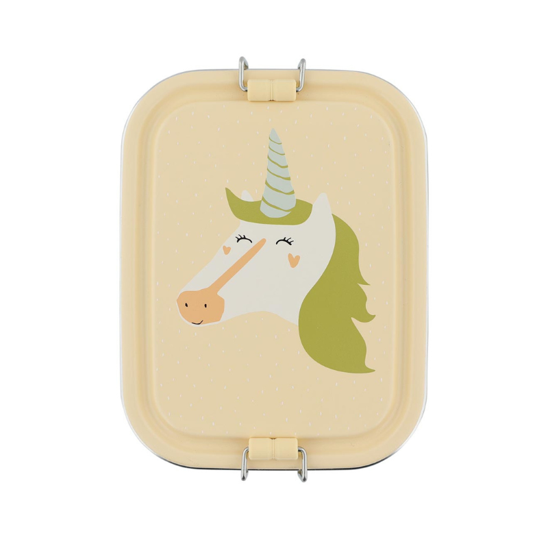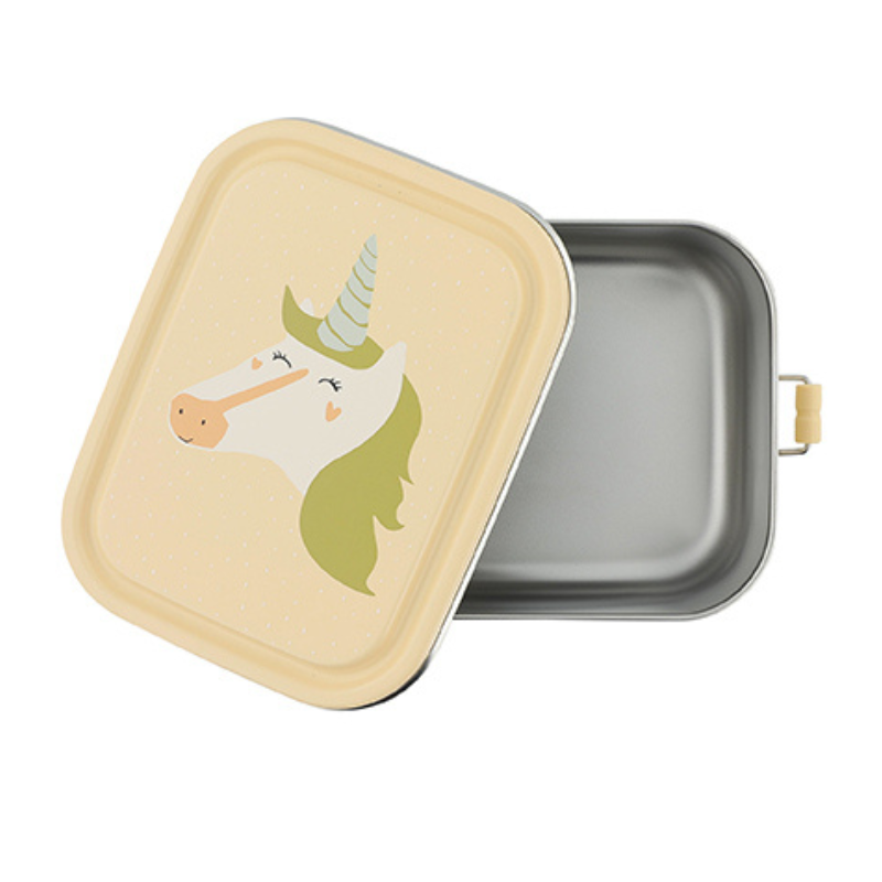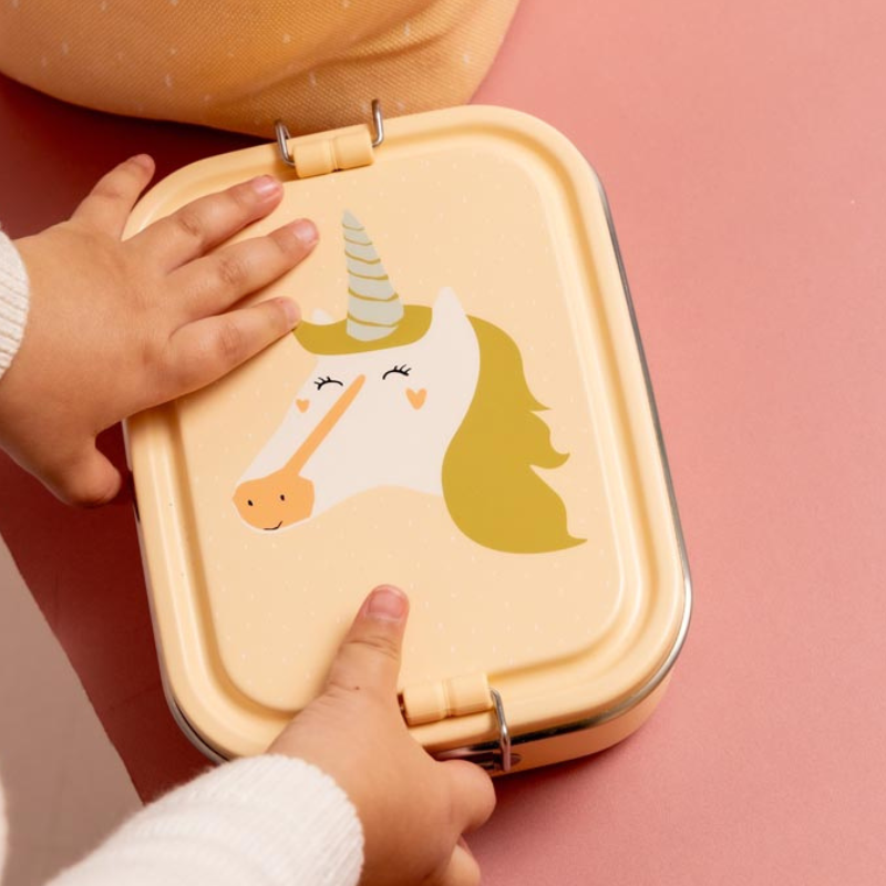 Com design encantador e estrutura resistente, a lancheira metálica Mrs. Unicorn é perfeita para lanches saudáveis e práticos na escola ou passeios.