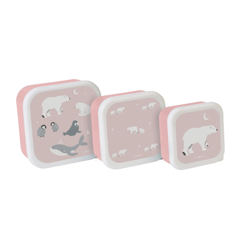 Conjunto de 3 caixas de lanche com tampas fáceis de abrir. Empilháveis, resistentes e ideais para levar snacks para a escola, passeios ou usar em casa.