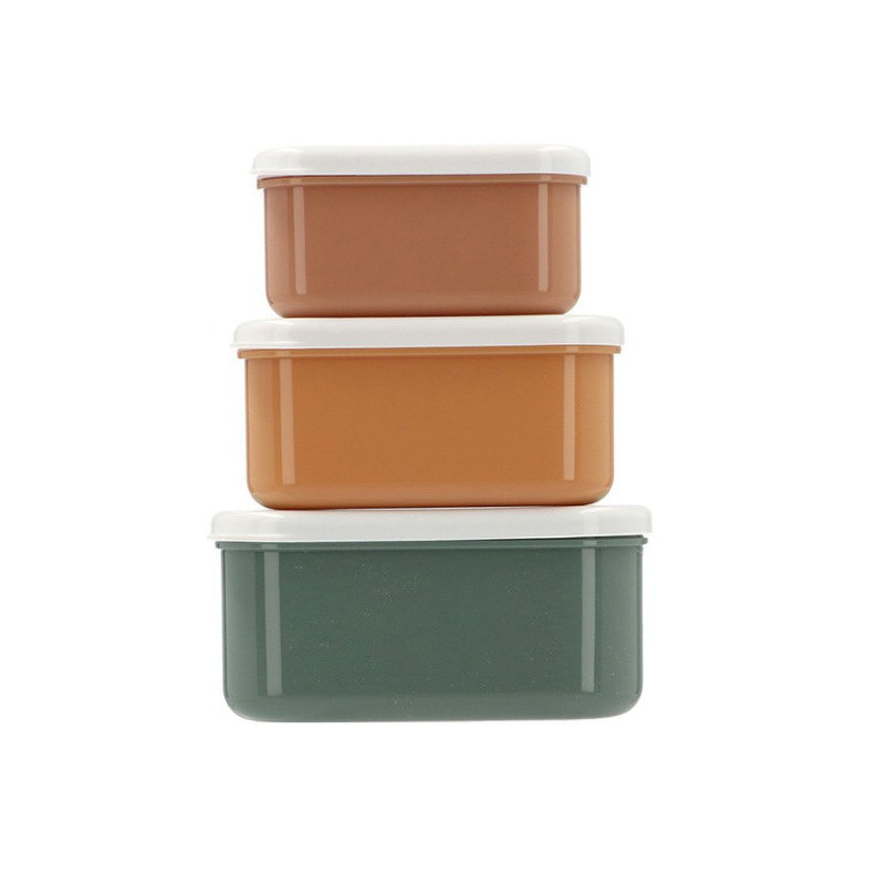 Conjunto de 3 caixas de lanche com tampas fáceis de abrir. Empilháveis, resistentes e ideais para levar snacks para a escola, passeios ou usar em casa. A partir dos 3 anos.