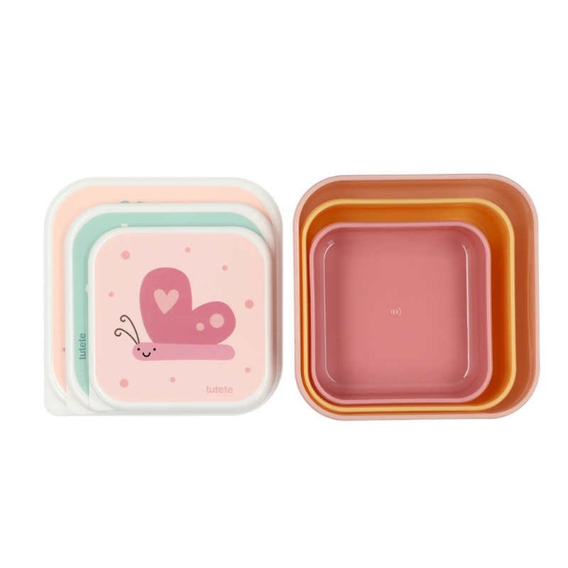 As Lancheiras Bugs da Tutete são perfeitas para guardar snacks, frutas ou pequenas refeições. Com 3 tamanhos diferentes, empilham-se facilmente e acompanham os mais pequenos em todos os passeios. Seguras, práticas e com um design que encanta!