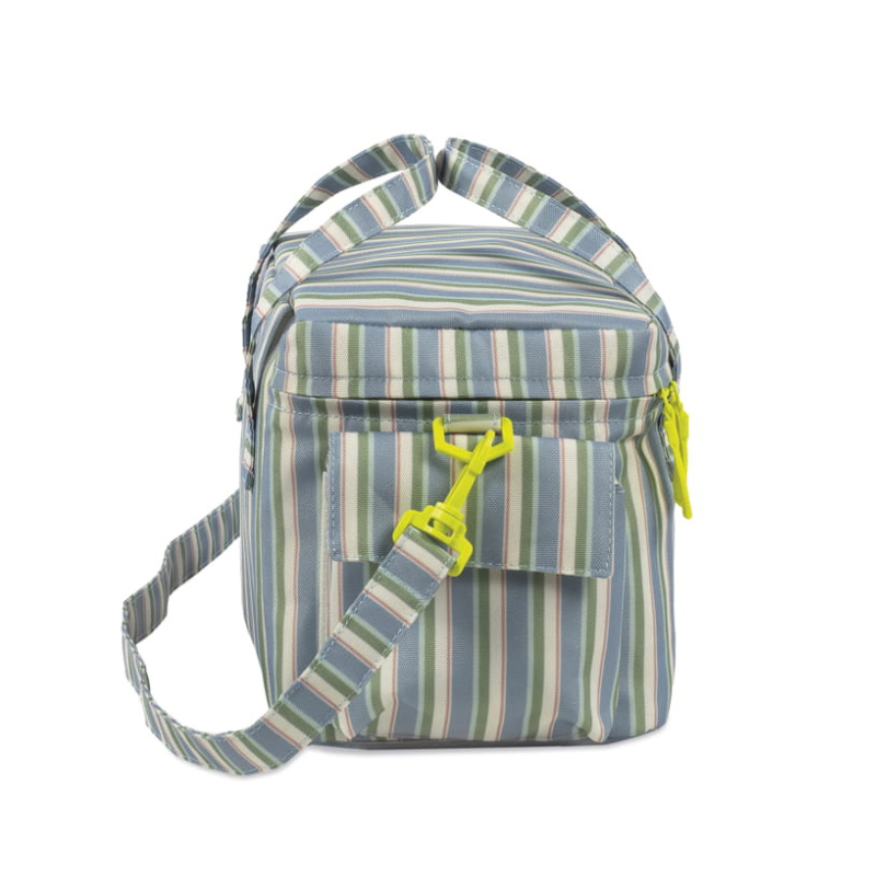 Lancheira térmica leve e prática com padrão às riscas, ideal para manter snacks e bebidas à temperatura durante passeios, escola ou praia. Dimensões: 23 x 18 x 16 cm.