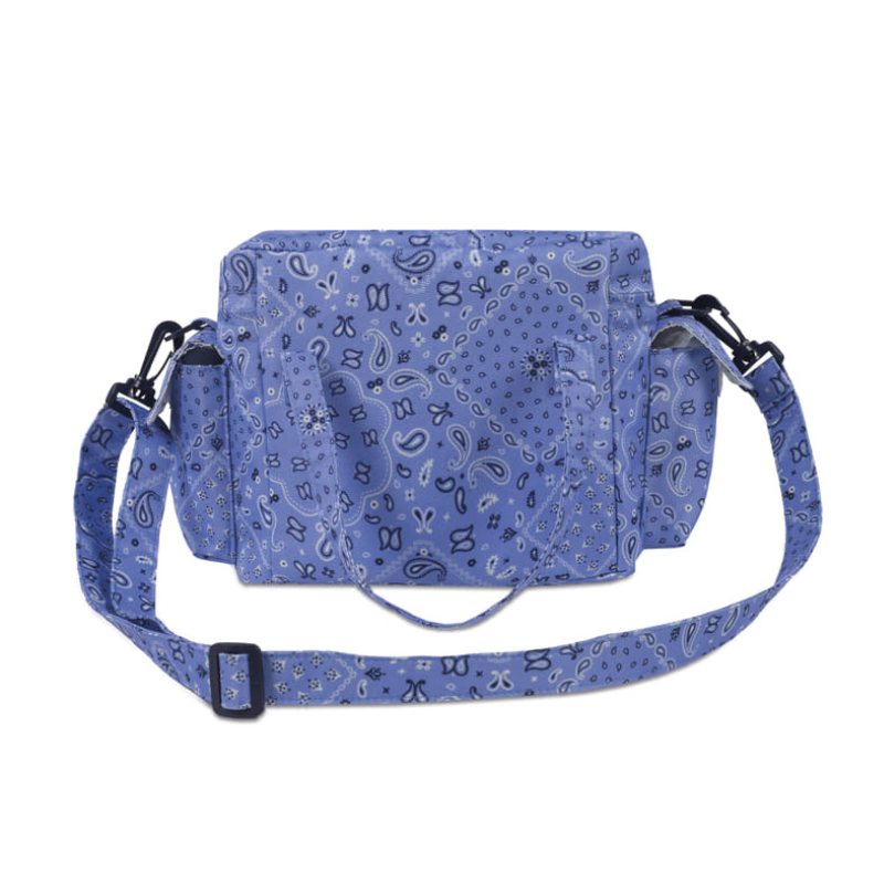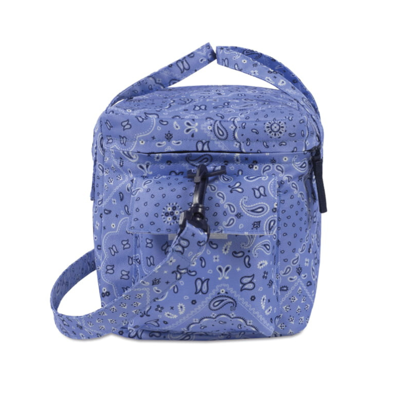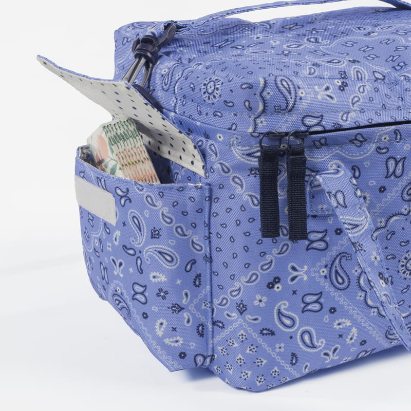 Lancheira térmica leve e prática com padrão bandana, ideal para manter snacks e bebidas à temperatura durante passeios, escola ou praia. Dimensões: 23 x 18 x 16 cm.