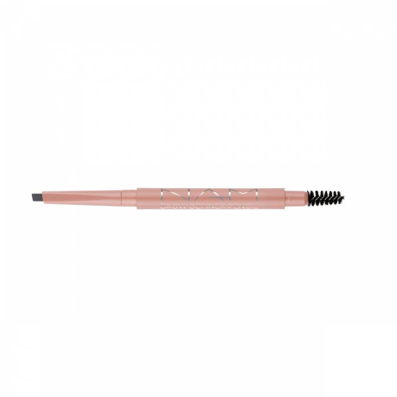 NAM Cosmetics Brow Definer Pencil 01 é um lápis profissional 2 em 1 que define os olhos com uma ponta de triângulo para moldar e preencher sobrancelhas, juntamente com um pincel delicado.