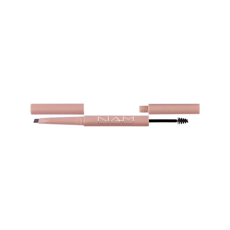 NAM Cosmetics Brow Definer Pencil 01 é um lápis profissional 2 em 1 que define os olhos com uma ponta de triângulo para moldar e preencher sobrancelhas, juntamente com um pincel delicado.
