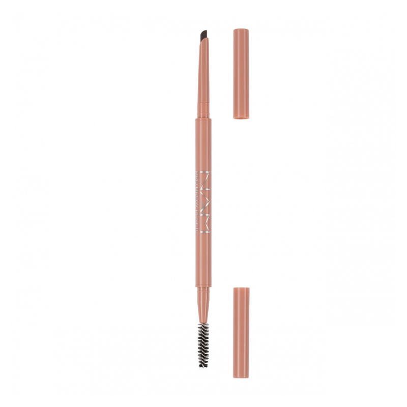 NAM Cosmetics Brow Definer Pencil 06 é um lápis de cor que define os olhos com uma ponta de triângulo para moldar e preencher sobrancelhas, juntamente com um pincel delicado.