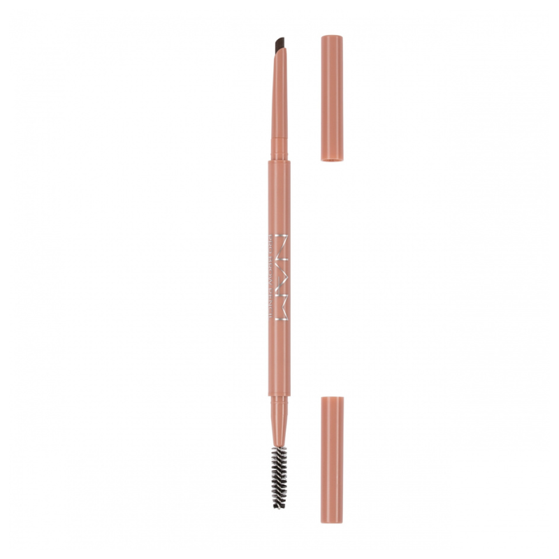 NAM Cosmetics Brow Definer Pencil 04 é um lápis de cor que define os olhos com uma ponta de triângulo para moldar e preencher sobrancelhas, juntamente com um pincel delicado.