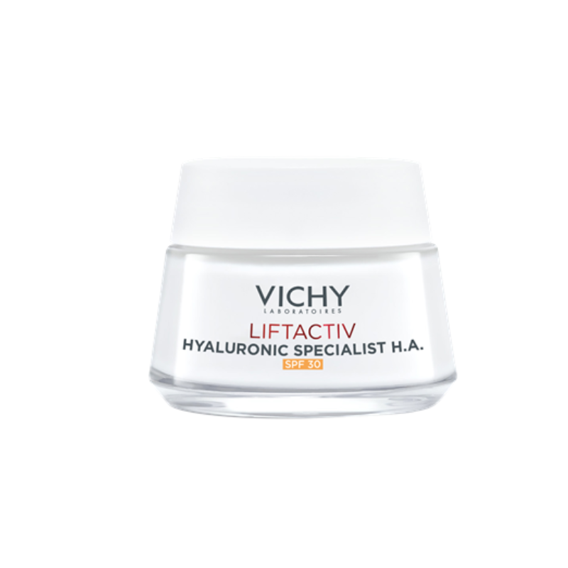 Vichy Liftactiv Hyaluronic Specialist HA Creme SPF30 suaviza as rugas, reforça a firmeza e protege a pele do sol.