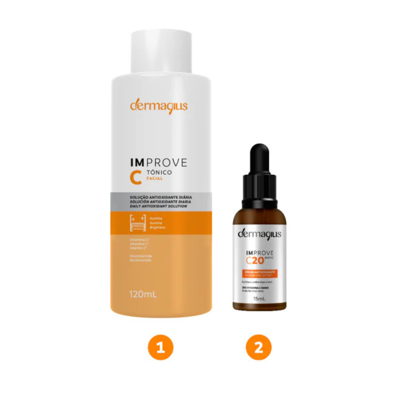 A rotina começa com o Improve C Tónico, que combina vitamina C estável, niacinamida e aminoácidos para preparar a pele, uniformizando o tom e controlando o brilho desde o primeiro passo.
