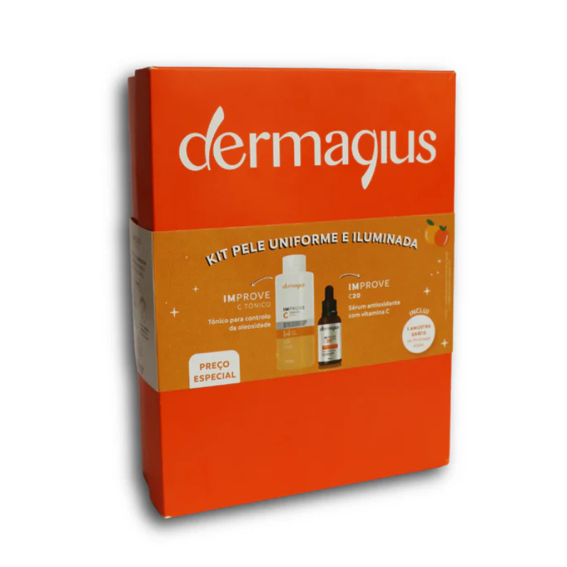Revela uma pele radiante, uniforme e com vitalidade! Este coffret da Dermagius foi formulado para quem procura iluminar o tom cutâneo, reduzir irregularidades e fortalecer a barreira da pele. Inclui dois produtos que atuam em sinergia: o Improve C Tónico (120 ml) e o Improve C20 Biotic Sérum (15 ml).