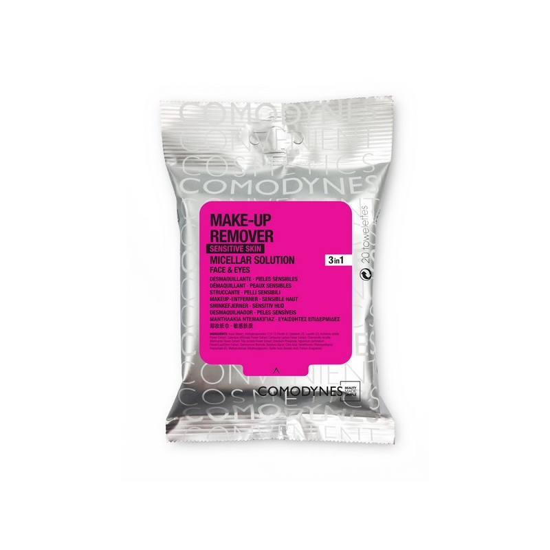 Comodynes Make-Up Remover Pele Sensível 20Uni toalhitas desmaquilhantes micelares com calêndula, hipericão, camomila, tília e centaurea cyanus para peles sensíveis.