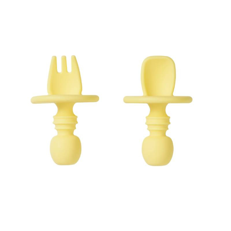 Pack com 2 colheres de bebé em silicone alimentar. Cabo ergonómico para fácil pega, seguro para gengivas sensíveis. A partir dos 12 meses.