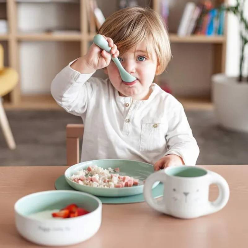 Saro Party Set Alimentação é um conjunto de alimentação, inclui um prato com ventosa para fixar à mesa, um copo pequeno e uma colher ergonómica especialmente desenhada para não agredir as gengivas.