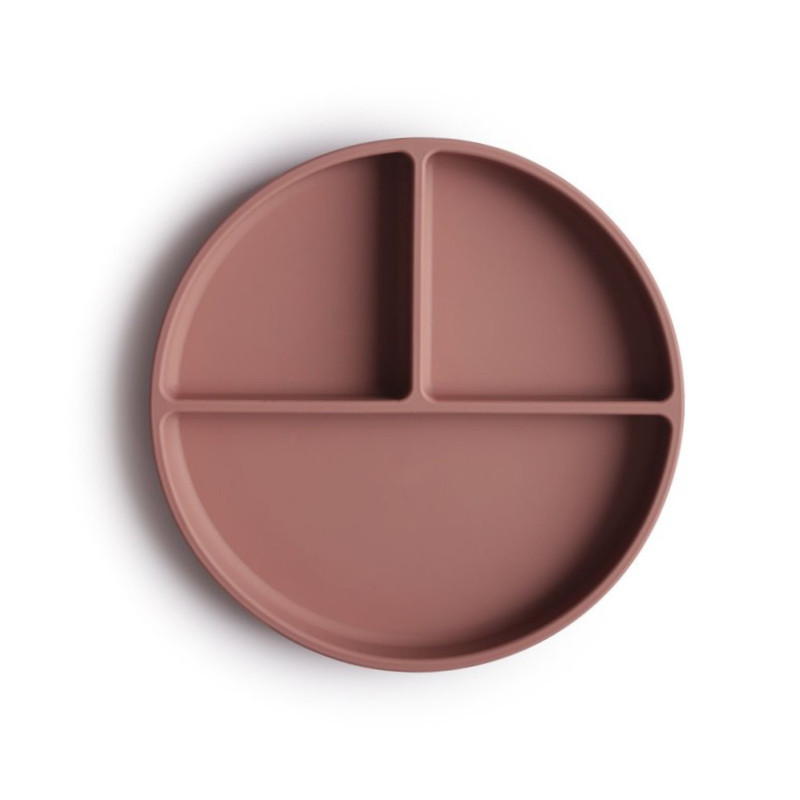 Prato divisórios de silicone Mushie cor Bordeaux para bebés +6 meses. Com ventosa que fixa à mesa e 3 compartimentos para separar alimentos. Ajuda no desenvolvimento e na descoberta de sabores. Próprio para micro-ondas e loiça.