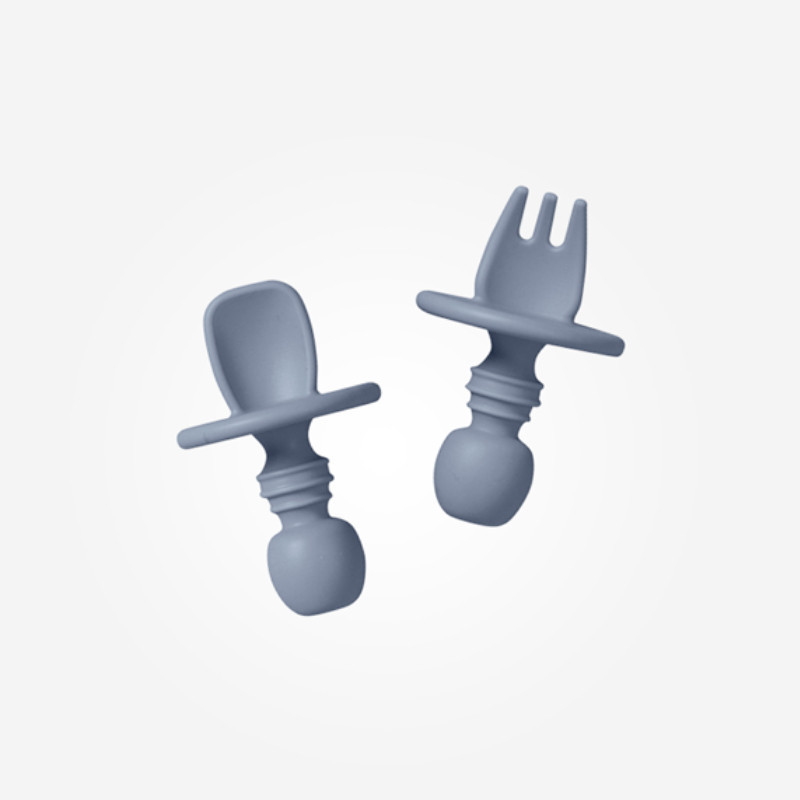 Pack com 2 colheres de bebé em silicone alimentar. Cabo ergonómico para fácil pega, seguro para gengivas sensíveis. A partir dos 12 meses.
