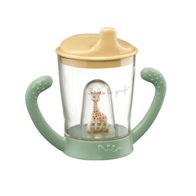 Sophie La Girafe Copo Anti-Fugas está equipado com um bico ergonómico que promove uma sucção natural comparável a um biberão, sendo o copo ideal para a transição do biberão para o copo.