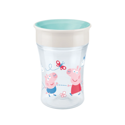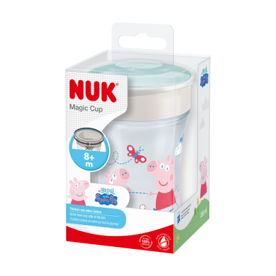 Mergulha no mundo alegre da Peppa Pig com o copo mágico da NUK, uma escolha perfeita para os pequenos a partir dos 8 meses, com uma borda de bebida de 360°, permite que a criança beba de qualquer lado, tornando o momento mais prático e divertido.