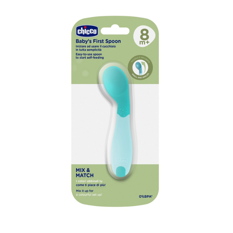 A Primeira Colher 8M+ da Chicco foi especialmente concebida para auxiliar o bebé nas suas primeiras tentativas de alimentação autónoma. O design inclinado e ergonómico simplifica o movimento, tornando a experiência mais intuitiva.