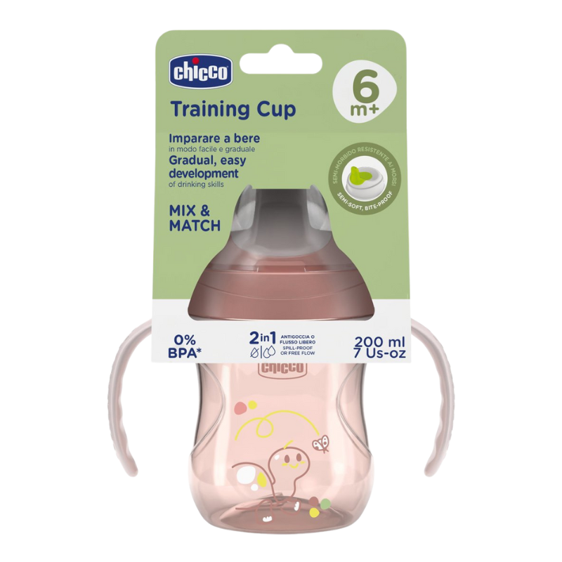 Chicco Copo Aprendizagem Rosa 6M+ anti-fugas com pegas removíveis e design ergonómico, equipado com uma válvula de ar dupla, projetado para diminuir a entrada de ar, para reduzir a sucção e desfrutar de uma bebida confortável.