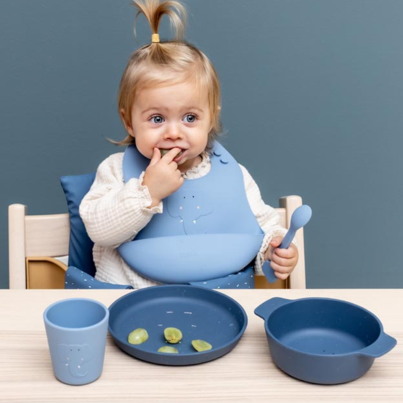 Saro Party Set Alimentação é um conjunto de alimentação, inclui um prato com ventosa para fixar à mesa, um copo pequeno e uma colher ergonómica especialmente desenhada para não agredir as gengivas.