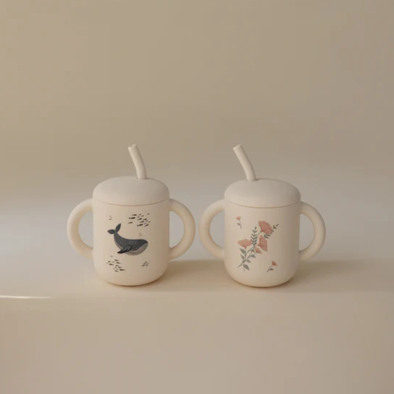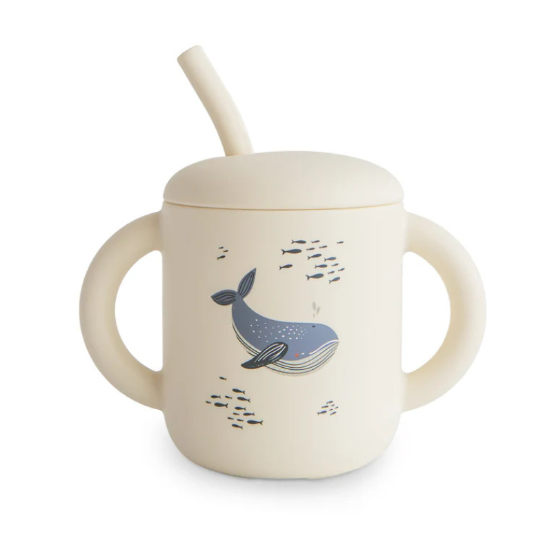 Este copo de transição de 175ml, com um divertido estampado de baleias, inclui uma tampa anti-derrames e uma palha de silicone macia. Ajuda bebés a partir dos 6 meses a aprenderem a beber sozinhos de forma segura, prática e estimulante.