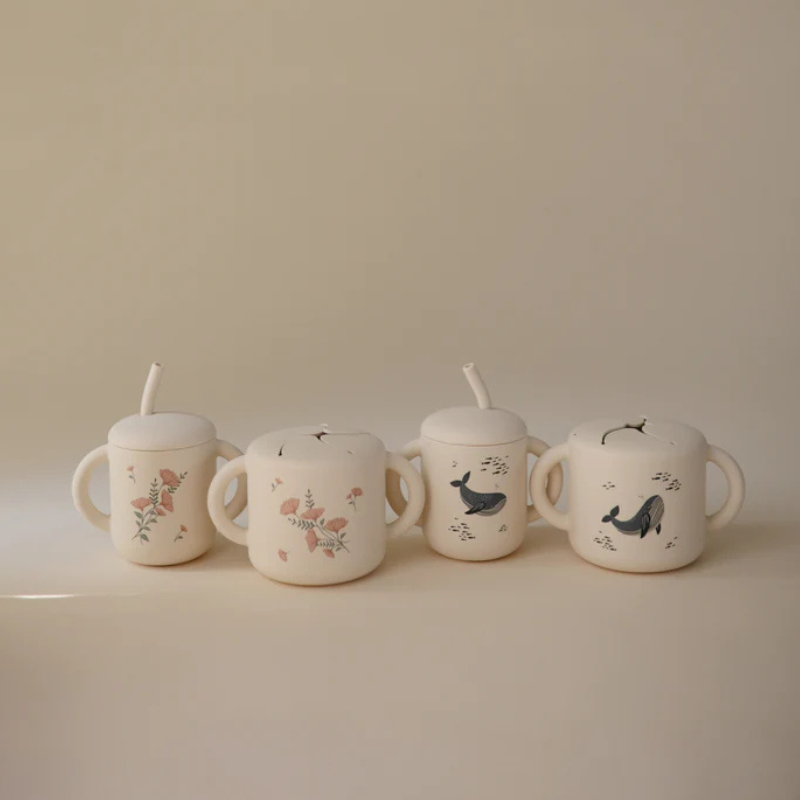 Copo de transição Mushie com padrão de baleias, para bebés +6 meses. Feito em silicone alimentar macio, design ergonómico e bocal resistente para a dentição. Fácil de limpar (máquina de loiça). Capacidade 175ml. Promove a autonomia.