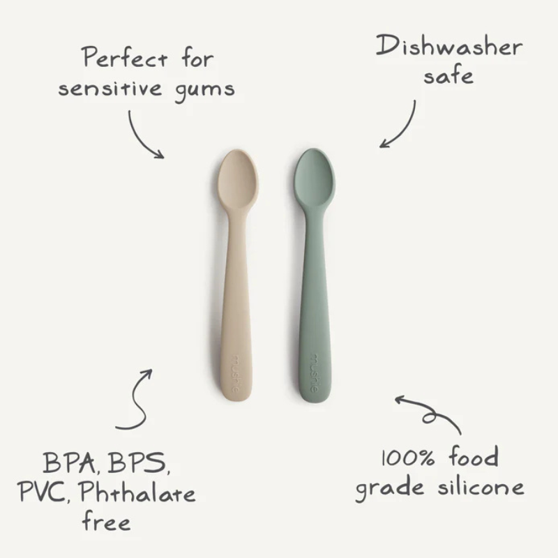 Pack com 2 colheres de bebé em silicone alimentar. Cabo ergonómico para fácil pega, seguro para gengivas sensíveis. A partir dos 12 meses.