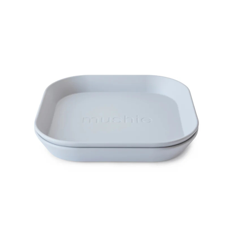 2 pratos quadrados, tom azul suave. Sem BPA, para micro-ondas e máquina de lavar louça. A simplicidade nórdica para as refeições do teu bebé, a partir dos 6 meses.