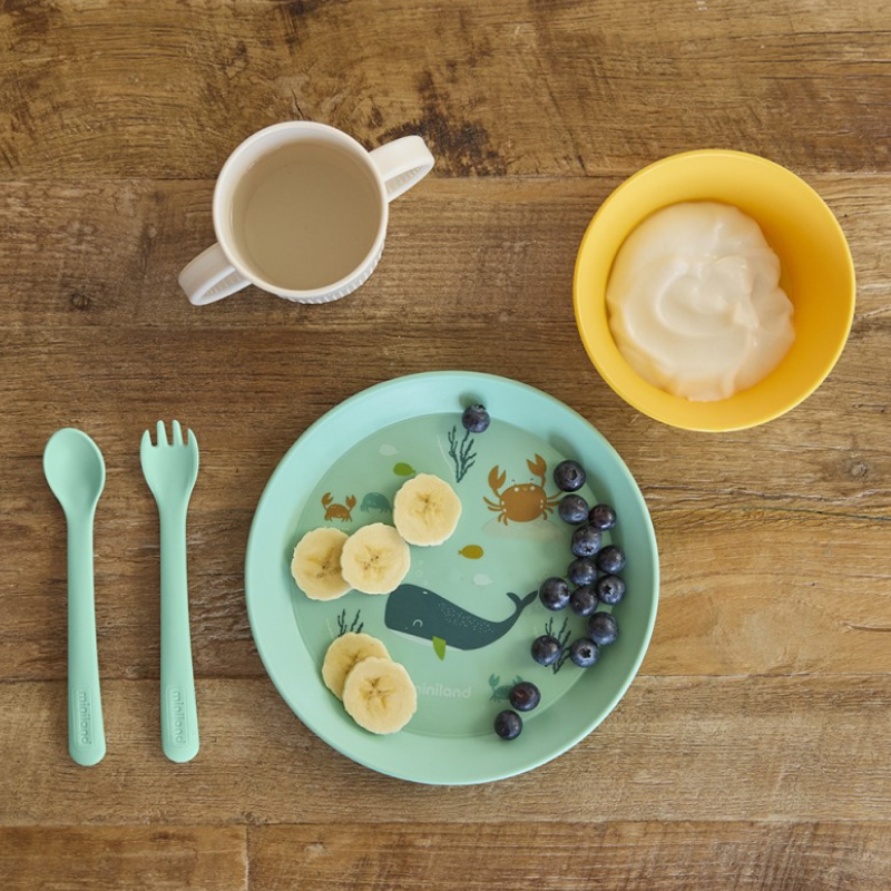 Conjunto de refeição BLW Miniland Ocean: prato, tigela anti-derrame, colher, garfo (pontas redondas) e copo de aprendizagem com pegas. Ideal para bebés aprenderem a comer sozinhos com segurança. Fabricado em Espanha, livre de tóxicos. Lavável na loiça e micro-ondas.