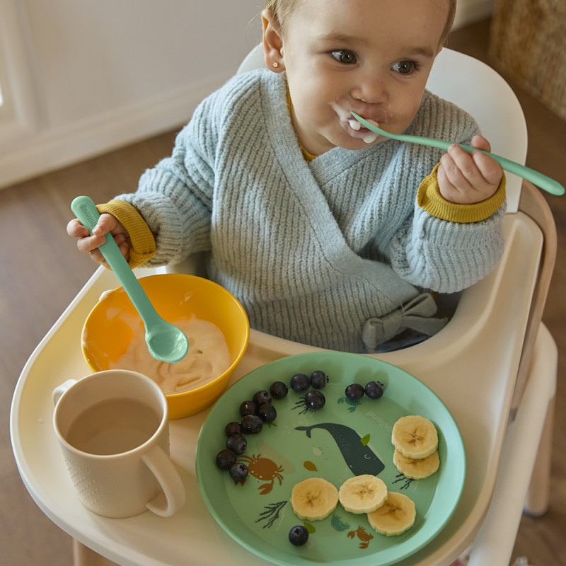 Ideal para bebés +6 meses que estão a iniciar a diversificação alimentar e a aprender a comer sozinhos.