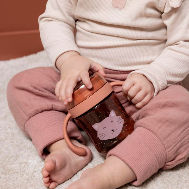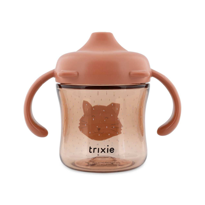 Copo de aprendizagem TRIXIE Mrs. Cat com pegas para bebés +4 meses. Design anti-derrame, pegas ergonómicas, material Tritan resistente e inquebrável. Lavável na máquina de loiça. Ideal para a transição do biberão.