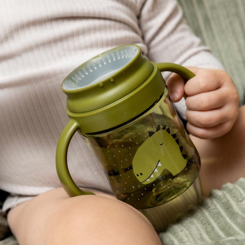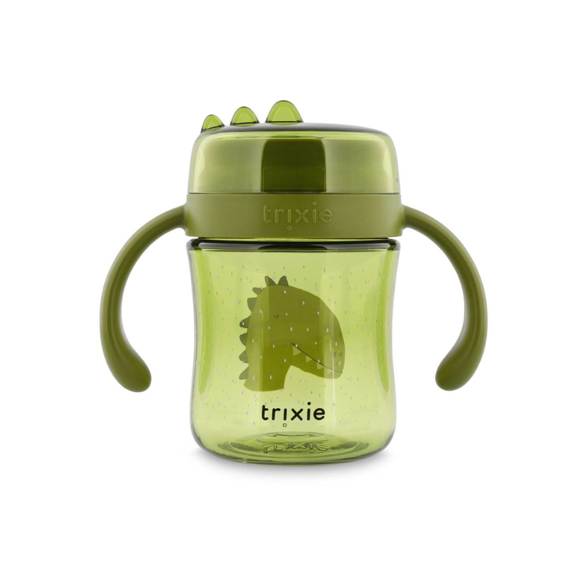 Copo de aprendizagem 360º TRIXIE para crianças +6 meses. Beber de qualquer lado com vedação automática anti-derrame. Pegas ergonómicas, material Tritan resistente. Lavável na loiça. Inclui tampa de viagem.