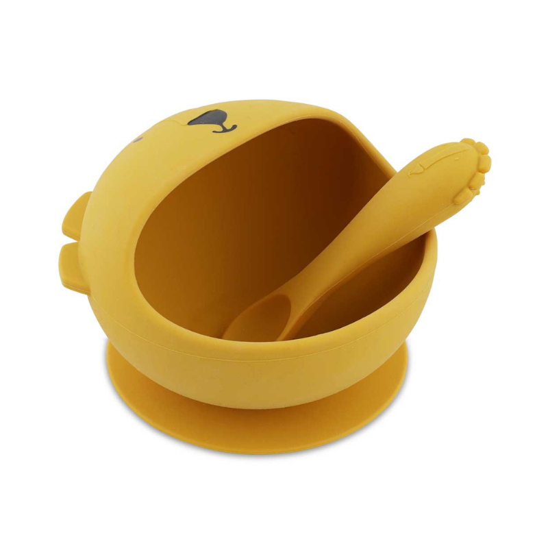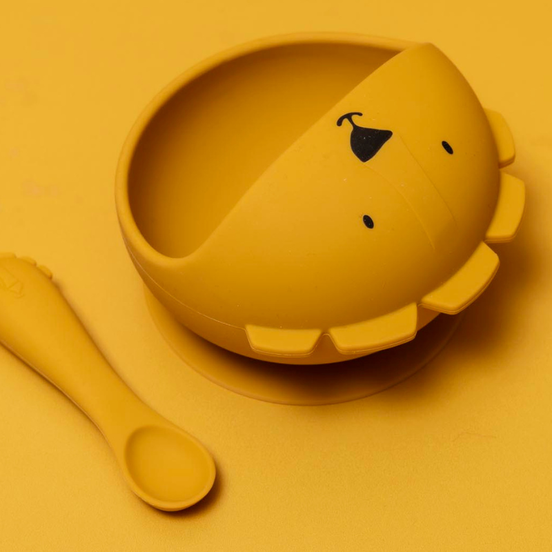Kit de refeição TRIXIE para bebés +4 meses. Inclui tigela de silicone com ventosa (fixa à mesa) e colher macia. Bordo que facilita a colherada. 100% silicone alimentar, lavável na loiça. Ideal para as primeiras refeições.