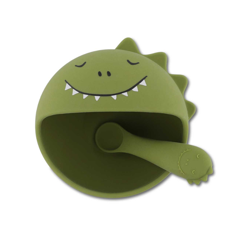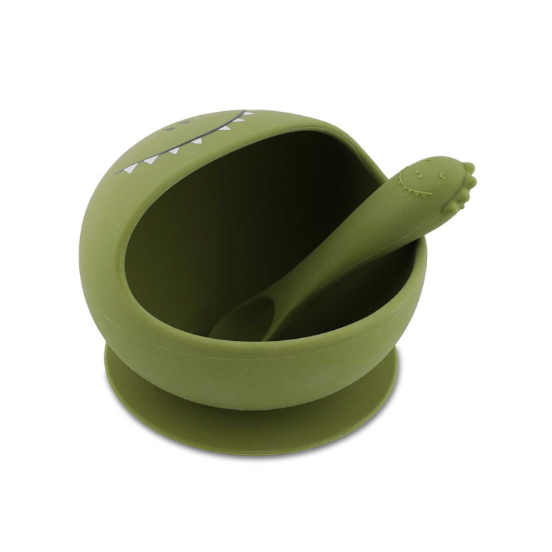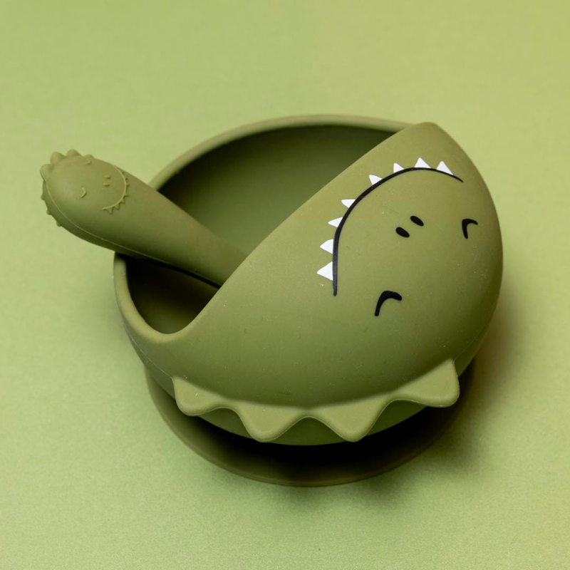 Kit de refeição TRIXIE para bebés +4 meses. Inclui tigela de silicone com ventosa (fixa à mesa) e colher macia. Bordo que facilita a colherada. 100% silicone alimentar, lavável na loiça. Ideal para as primeiras refeições.