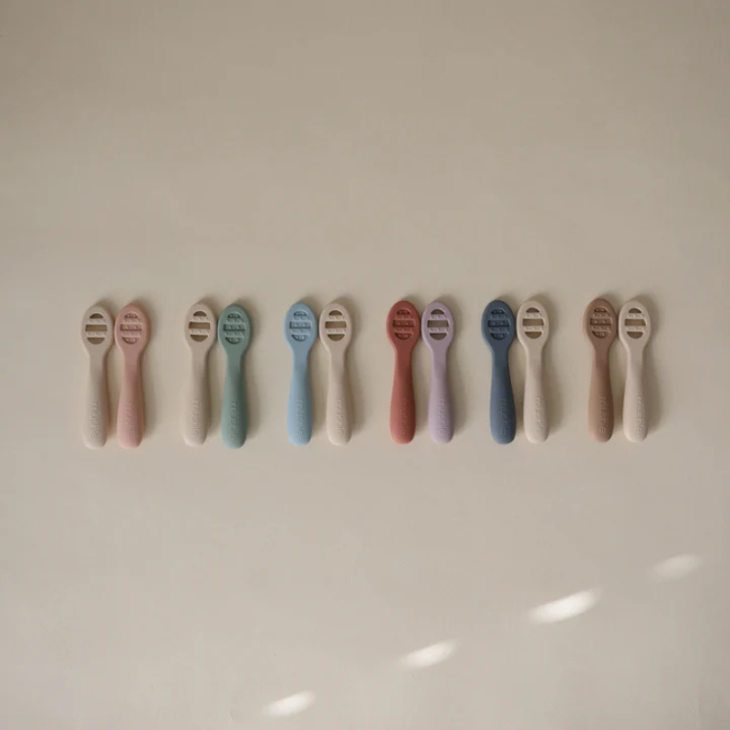 Colheres de alimentação MUSHIE (2 unidades) design 2 em 1: lado liso para purés, lado com fendas para alimentos espessos. Pontos sensoriais para dentição. Silicone alimentar, livre de BPA.