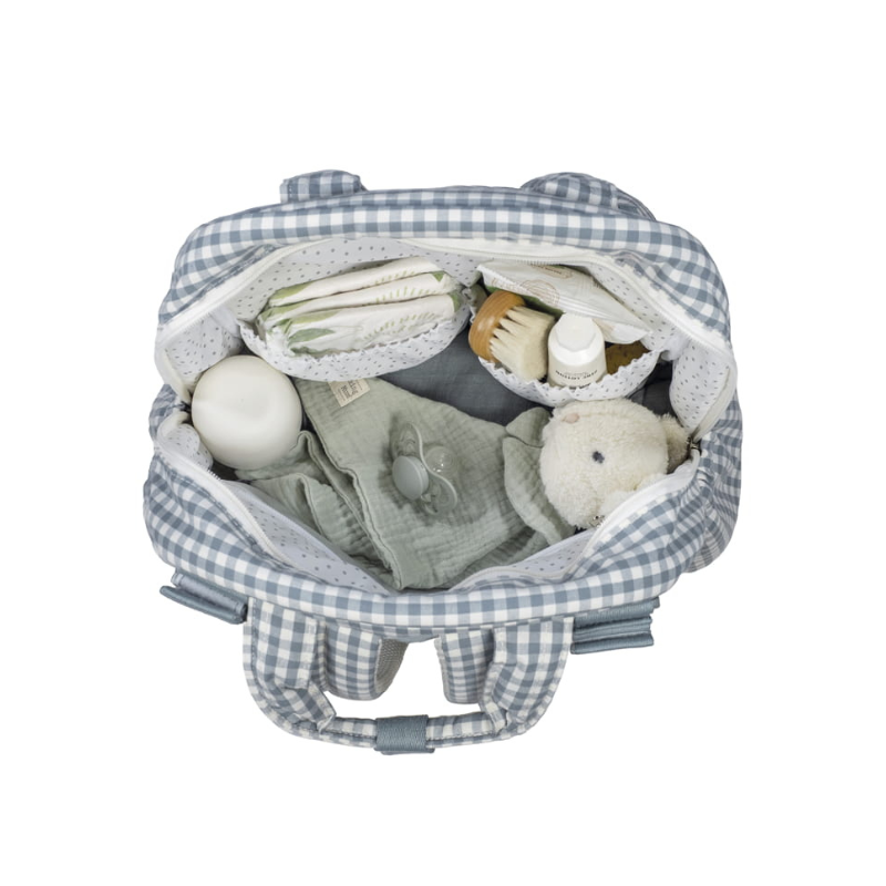 Porta documentos de bebé com padrão aos quadrados, vários bolsos e fecho zip. Prático, resistente e ideal para o dia a dia.