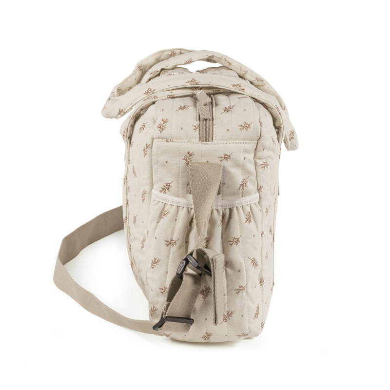 O seu design em veludo canelado texturizado e a cor bege moderna fazem dele muito mais que um simples saco. Inclui muda, bolso isotérmico, bolsa para chupetas, mosquetão para mala, bolso removível de 4,5L, porta-chaves, correias para carrinho e bandoleira. Pode ser levado à mão, ao ombro ou transversal. Lavável na máquina (30ºC).