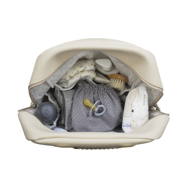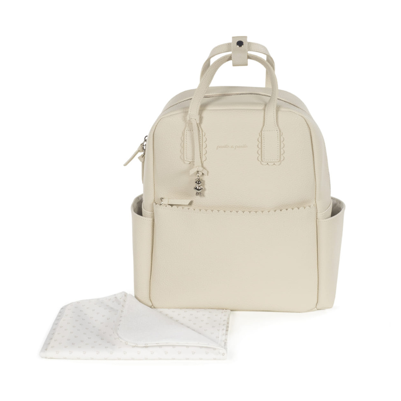 A Mochila Icon Cream de Pasito a Pasito combina design elegante em polipiel resistente com máxima praticidade, ideal para transportar todos os essenciais do bebé no dia a dia.