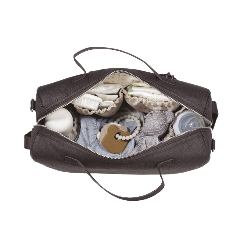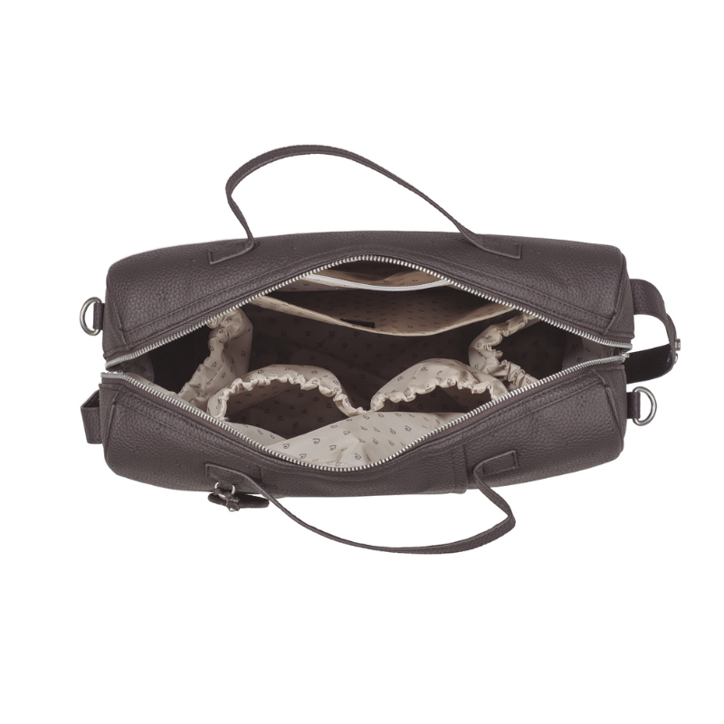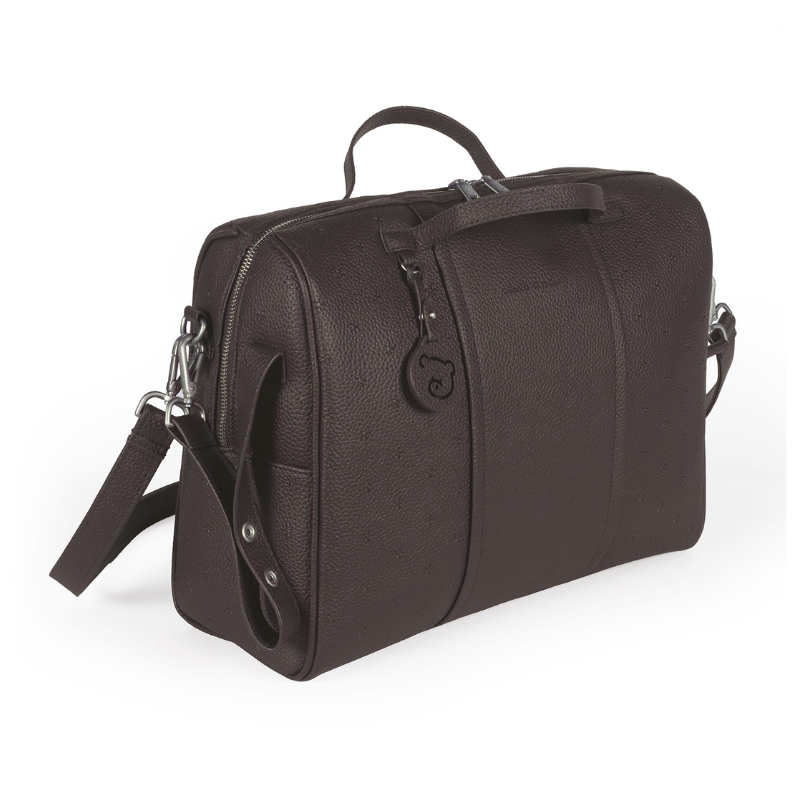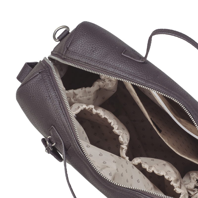 Bolsa de maternidade Pasito a Pasito London Brown em polipele granulado. Organização impecável com 5 bolsos, incluindo 2 térmicos. Inclui trocador a condizer. Versátil, elegante e fácil de limpar. 38x28x16 cm.