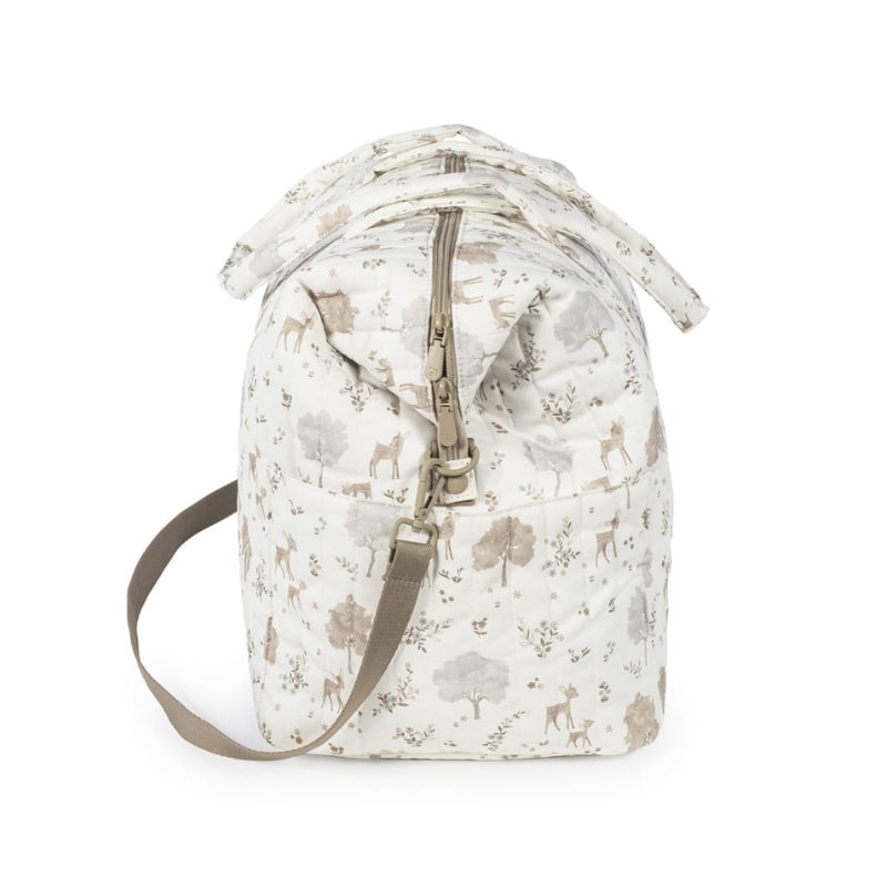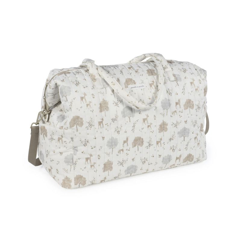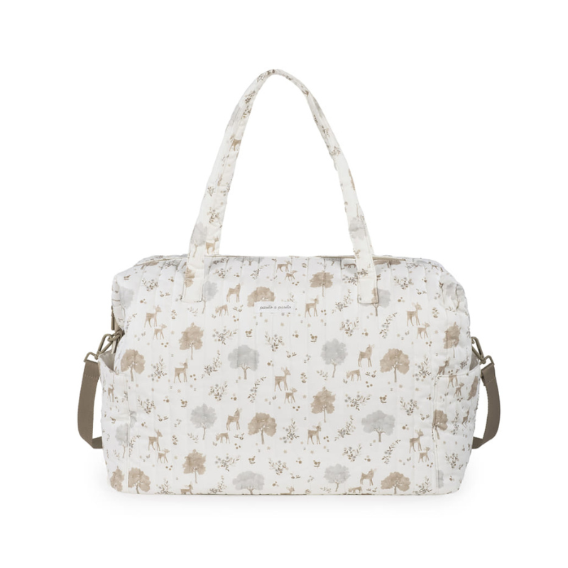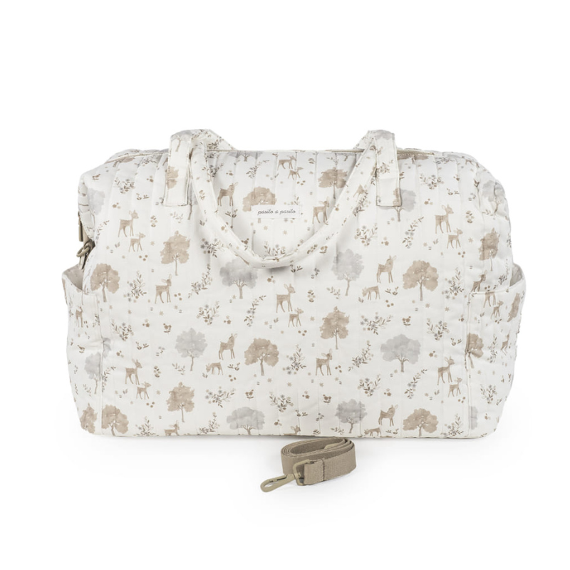 A Bolsa XL Nara da Pasito a Pasito é para quem precisa de espaço sem abrir mão do design. Feita em algodão 100% com um estampado delicado de cervos e árvores em tons neutros, é bonita por fora e impecável por dentro.
