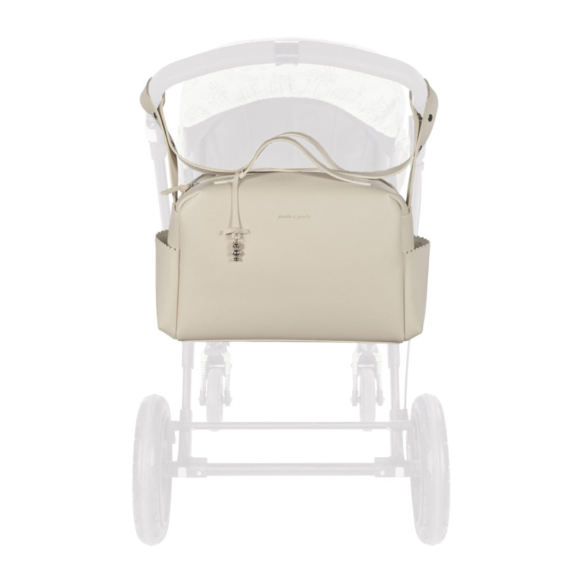 O seu design em veludo canelado texturizado e a cor bege moderna fazem dele muito mais que um simples saco. Inclui muda, bolso isotérmico, bolsa para chupetas, mosquetão para mala, bolso removível de 4,5L, porta-chaves, correias para carrinho e bandoleira. Pode ser levado à mão, ao ombro ou transversal. Lavável na máquina (30ºC).