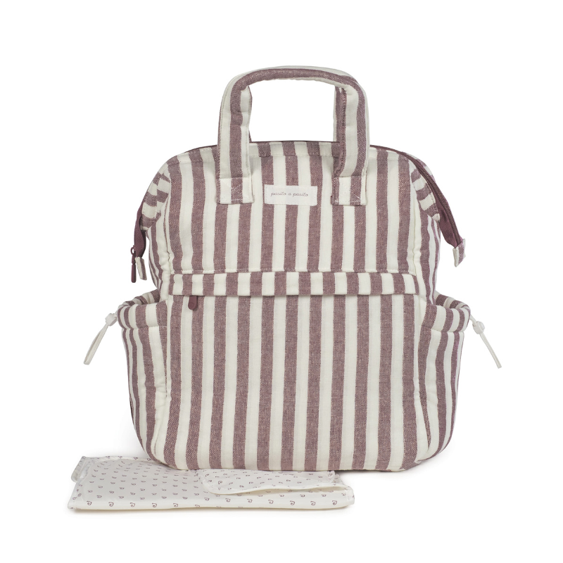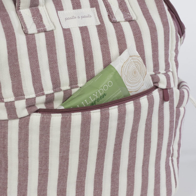 Mochila maternal Pasito a Pasito Cherry Strips em algodão 100% com estampado floral. Tratamento impermeável. Múltiplos bolsos, incluindo 2 laterais térmicos. Alças para as costas, mão e carrinho. Inclui trocador portátil. Lavável à máquina. Livre de substâncias nocivas.