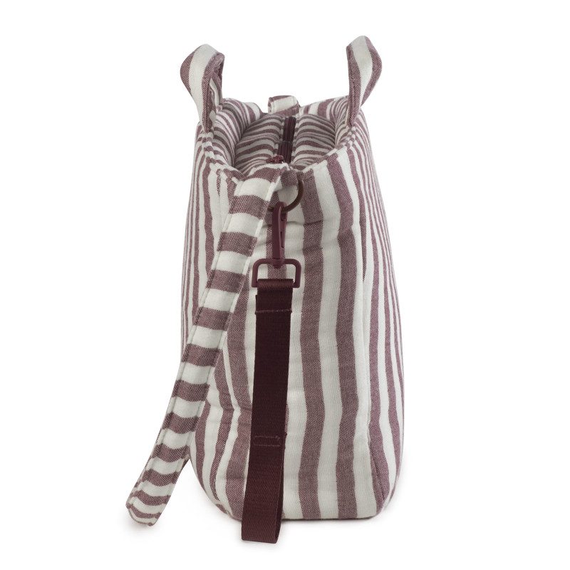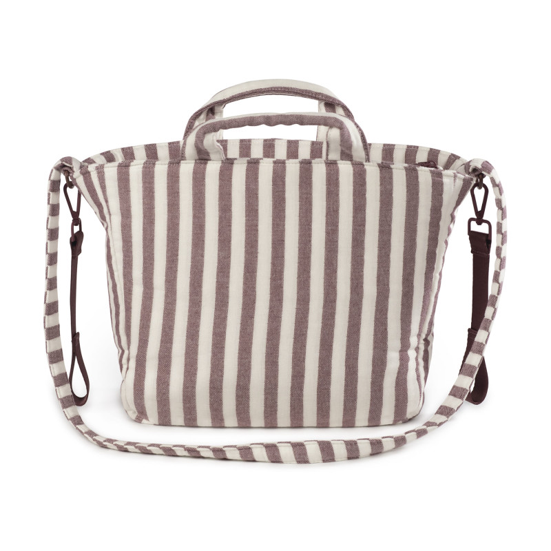 Saco muda fraldas Pasito a Pasito Cherry Strips em algodão 100% com padrão de riscas. Inclui trocador. Bolso térmico para biberões, bolso plastificado para roupa molhada. Alças para ombro, mão e carrinho. Lavável à máquina.