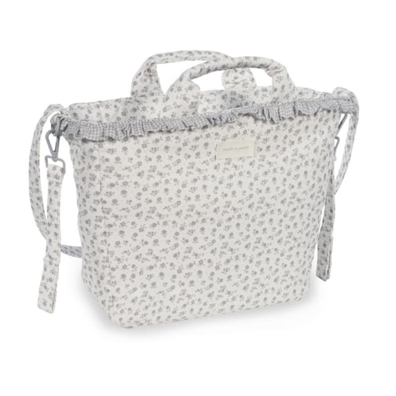 Fabricada em algodão 100% com delicado padrão floral, possui tratamento resistente à água, garantindo maior durabilidade no uso diário. O seu design espaçoso permite transportar tudo o que precisa, desde fraldas e toalhitas a roupas e acessórios.