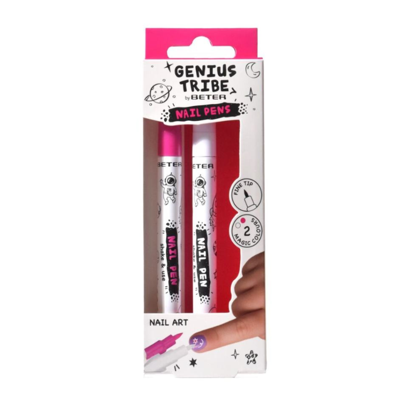 Marcadores de unhas BETER Genius Tribe: cria nail art fácil com as cores rosa e branco. Ponta fina, aplicação simples (agitar e desenhar). Remove com água e sabão. Vegan e sem glúten. Para todas as idades (com supervisão).