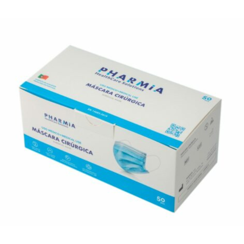 Caixa de 50 Máscaras Cirúrgicas Tipo IIR, cor azul, tamanho adulto. Alta proteção com eficiência de filtração bacteriana >98% (BFE>98%), resistentes a salpicaduras, com 3 camadas e baixa resistência respiratória. Inclui adaptador nasal moldável. Descartáveis, conforme norma EN 14683:2019.