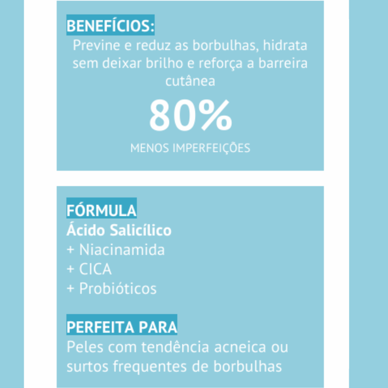 Mais do que hidratar, esta máscara é uma fórmula de tratamento multifacetada que atua nas várias causas das borbulhas: desobstrui os poros, combate as bactérias, reduz a inflamação e regula a oleosidade, tudo isto enquanto acalma e reforça a pele.