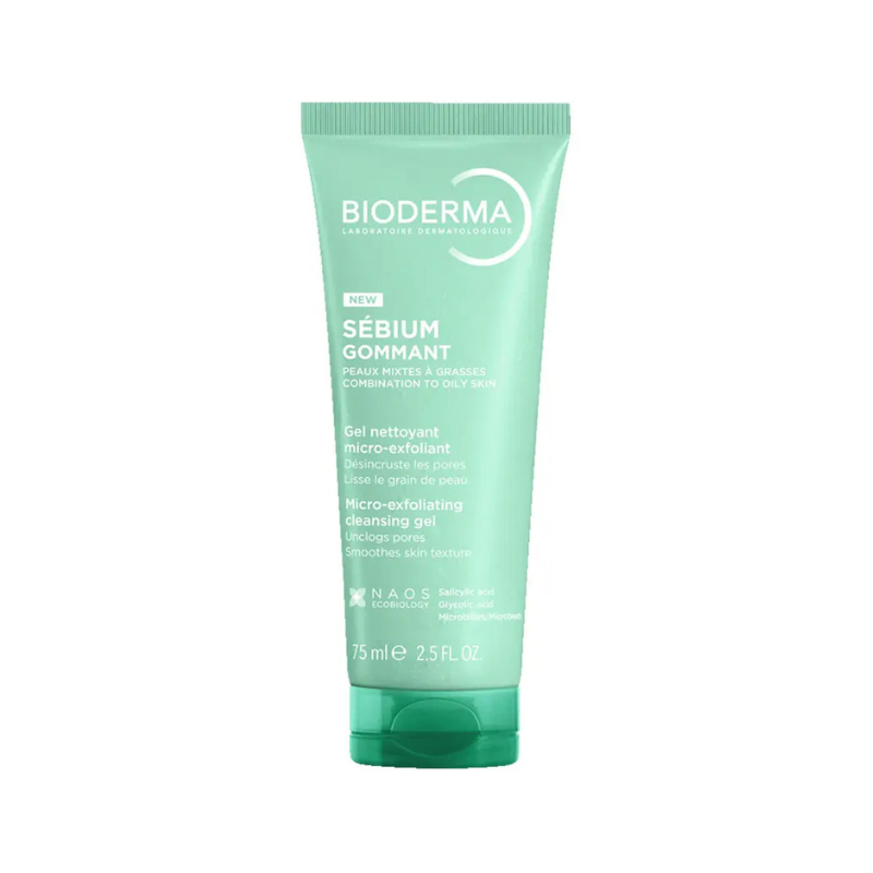 Gel esfoliante BIODERMA Sébium Gommant (75ml) para pele mista a oleosa. Esfoliação suave que remove impurezas, fecha os poros e prepara a pele para o tratamento. Não comedogénico, sem sabão. Para usar 1-2 vezes por semana.